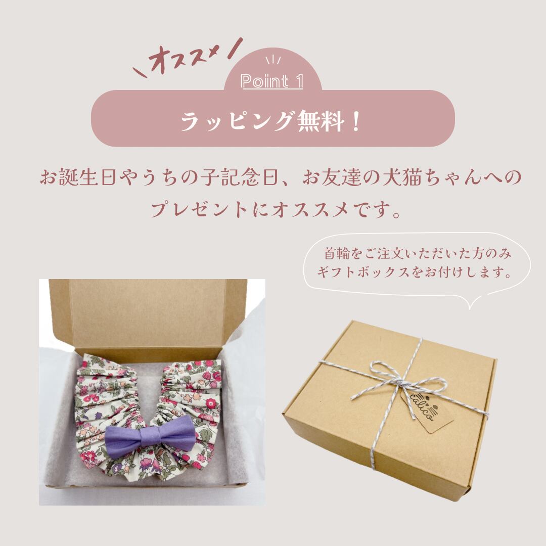 リバティ社のタナローン生地〈Emily〉を使用した首輪です。タナローン生地はシルクのような艶と手触りが特徴で、とても柔らかい素材ですので皮膚が弱い子にもオススメです。